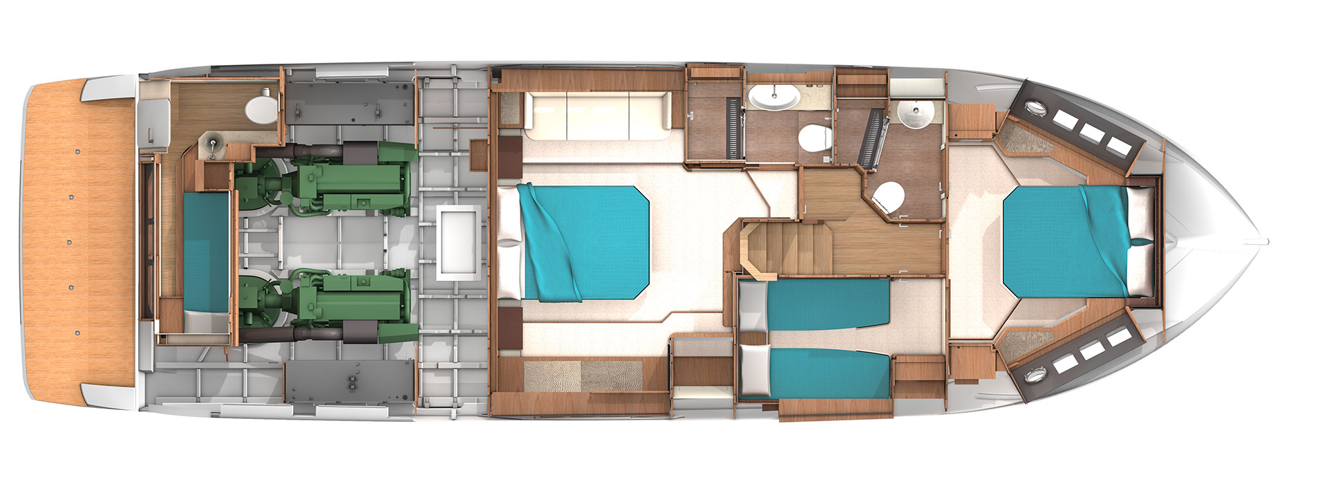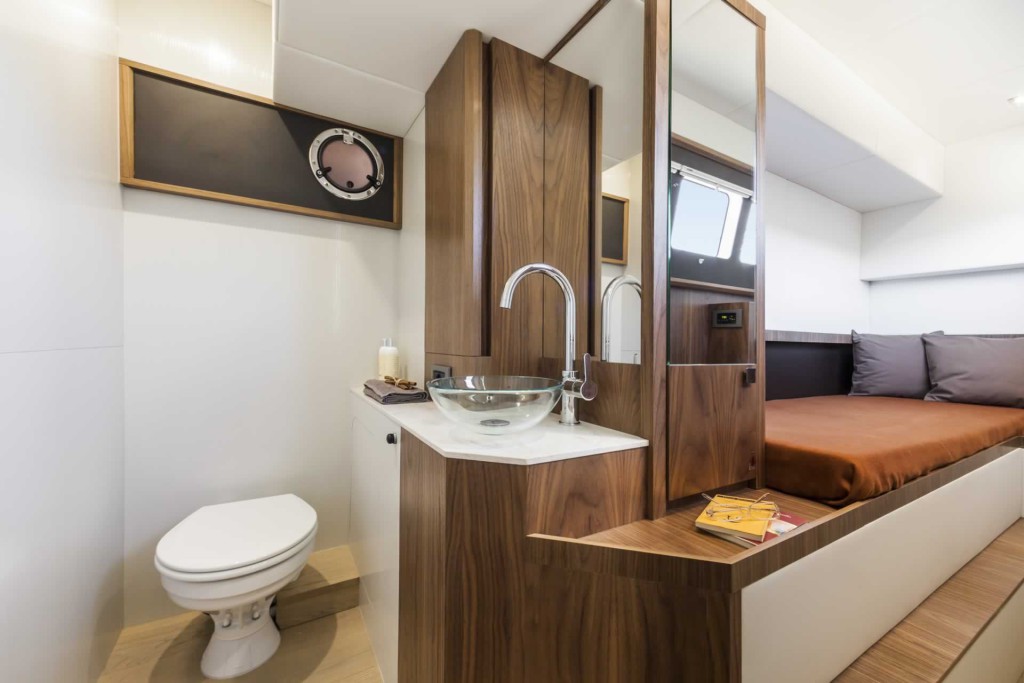 Il 56 Sty, al suo interno, dimostra ancora l’instancabile lavoro di progettazione del cantiere Absolute; si contraddistingue, infatti, per l’eccezionale altezza delle 3 cabine, tanto che, nel 56 Sty, non sembra di trovarsi a bordo di una barca, ma di essere a casa.